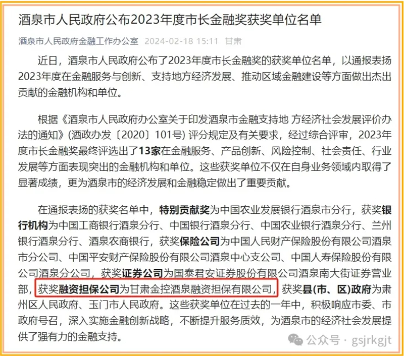 近日,酒泉市人民政府公布了2023年度市長金融獎的獲獎單位名單,通報表揚2023年度在金融服務(wù)與創(chuàng)新、支持地方經(jīng)濟發(fā)展、推動區(qū)域金融建設(shè)等方面做出杰出貢獻的金融機構(gòu)和單位,甘肅金控酒泉融資擔(dān)保有限公司榮獲酒泉市“2023年度市長金融獎”。